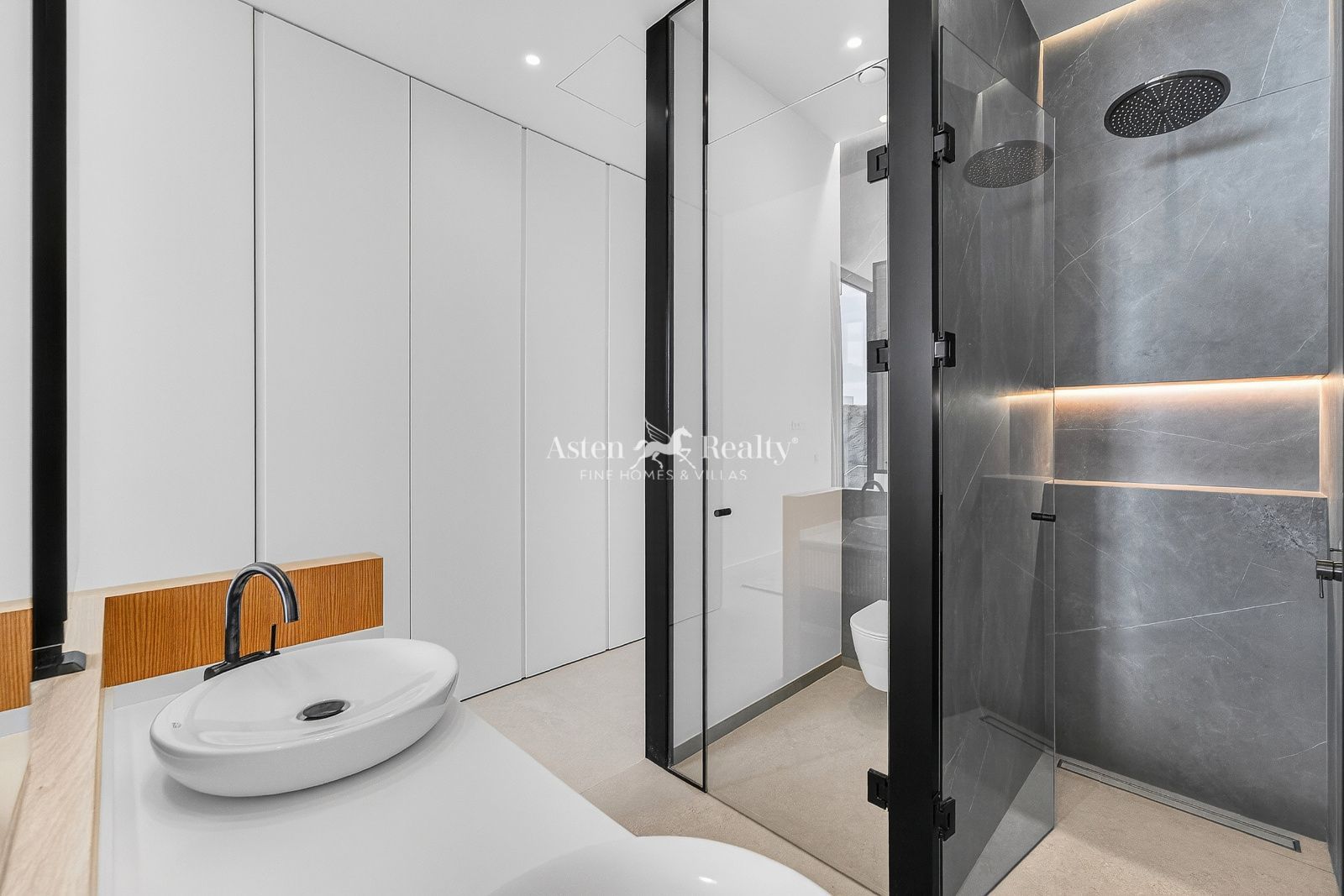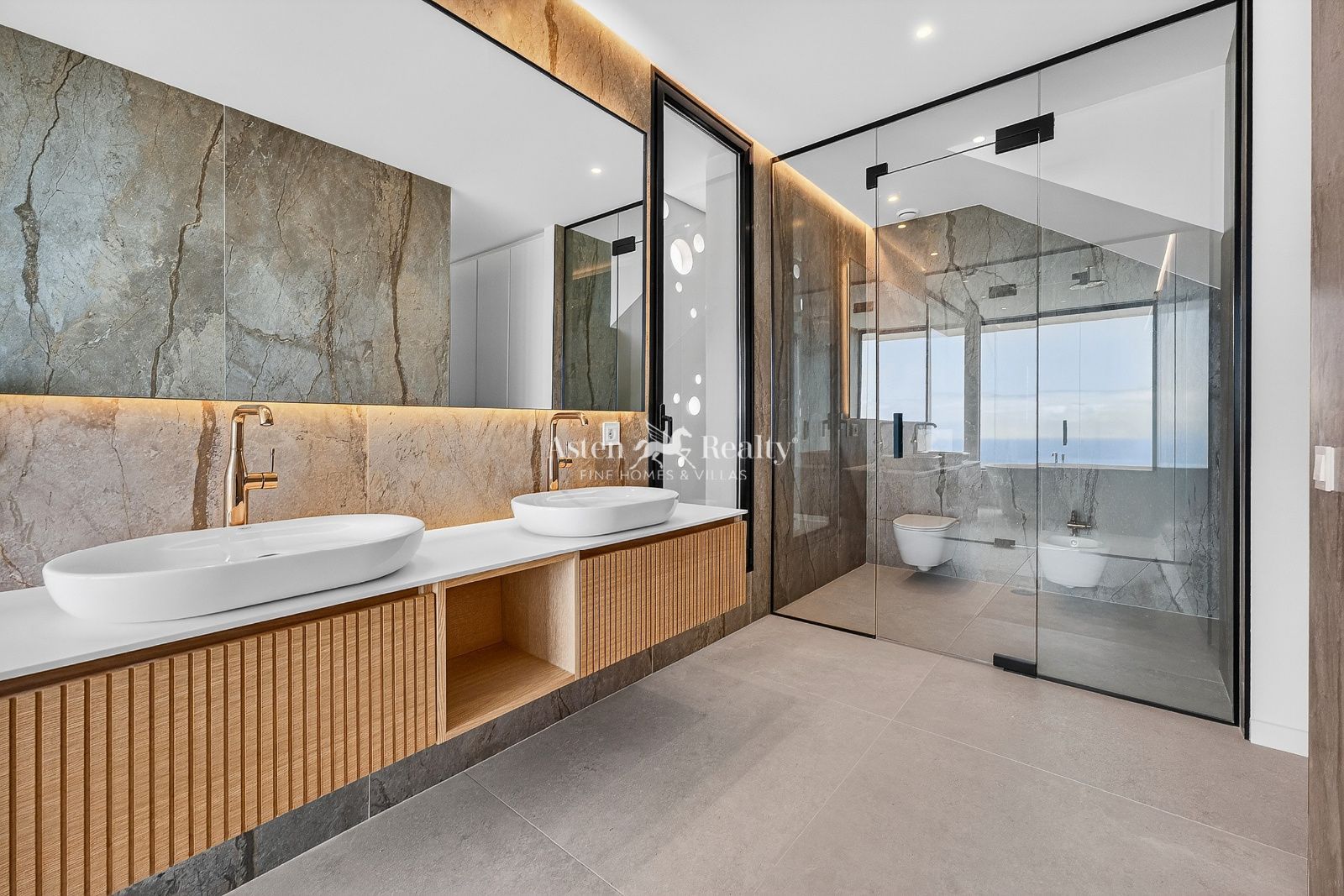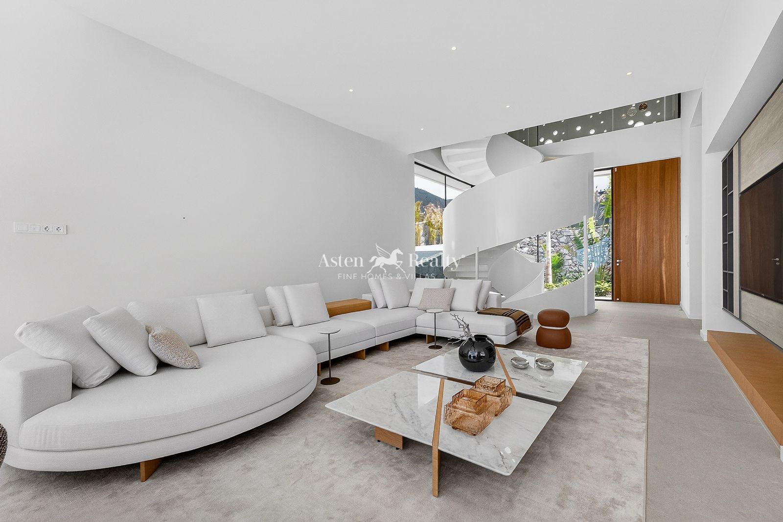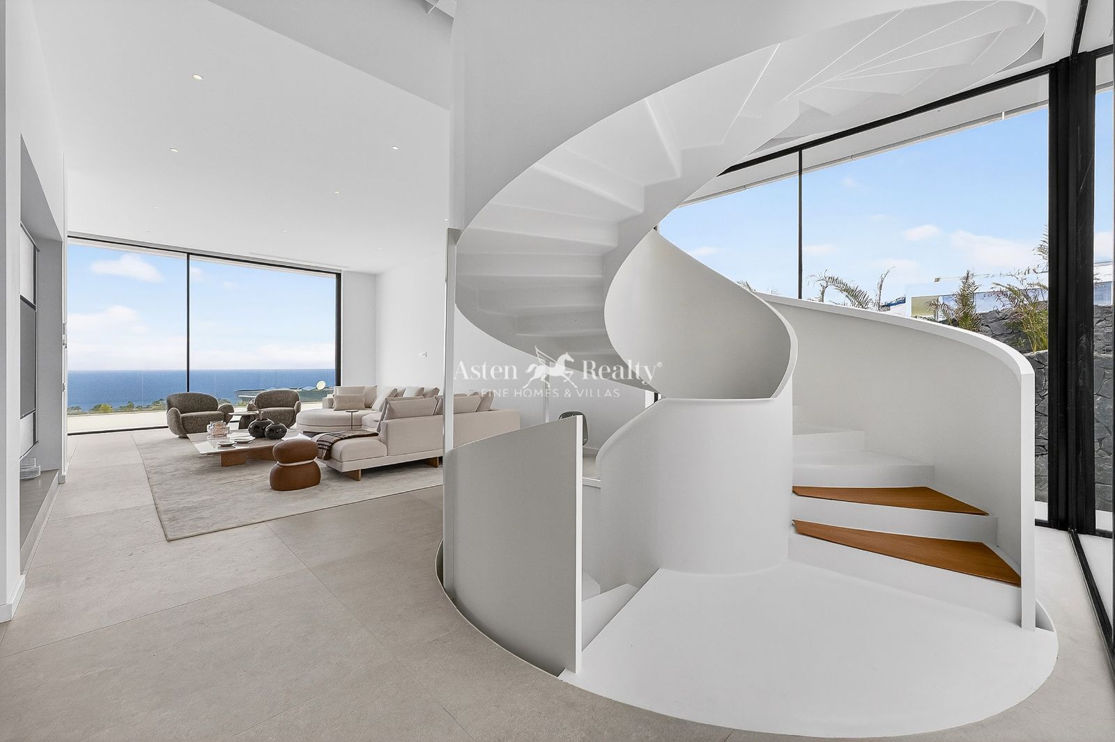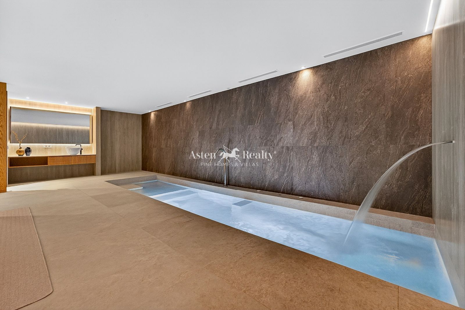En la planta baja, la villa sorprende con una zona de bienestar privada que incluye spa, sauna, gimnasio, sala polivalente y un amplio garaje para cuatro vehículos. Las tres plantas están conectadas por un ascensor y una escalera escultural que añade presencia y carácter a la arquitectura.