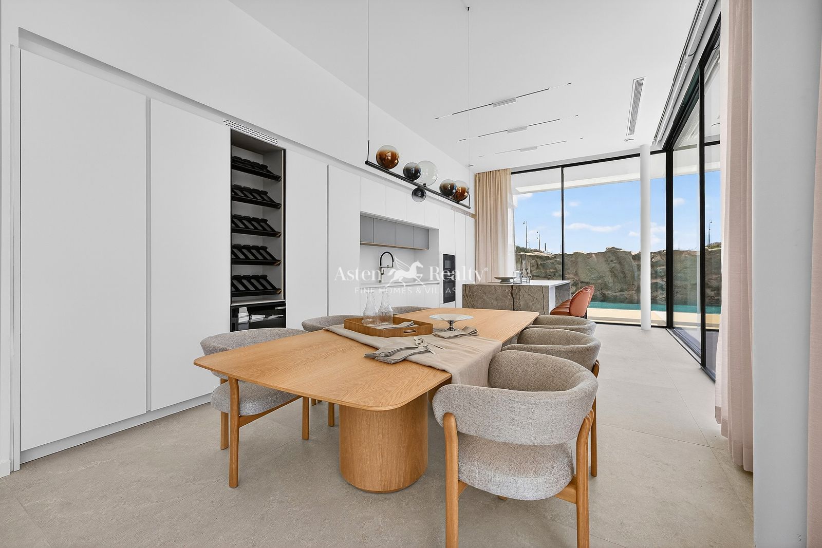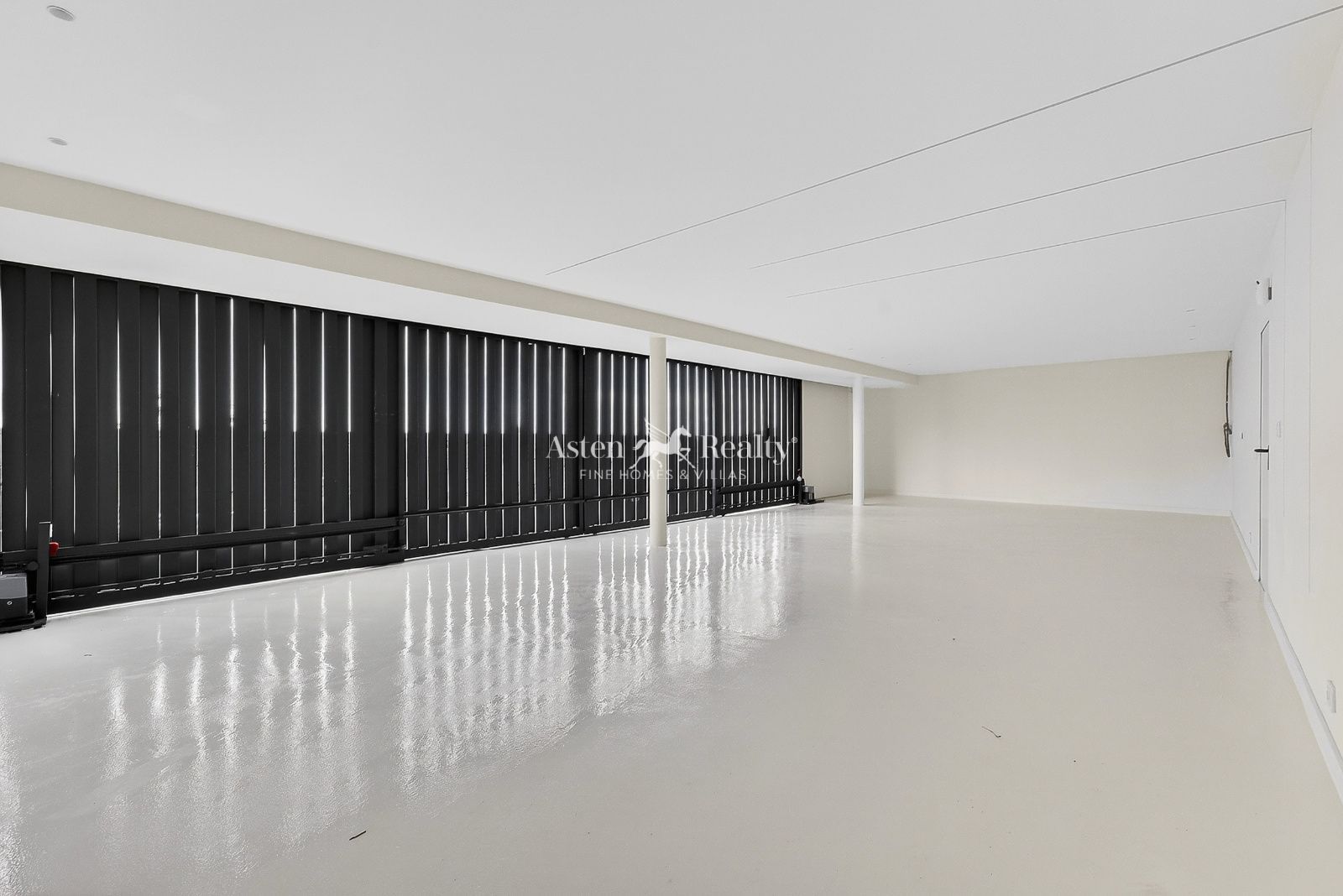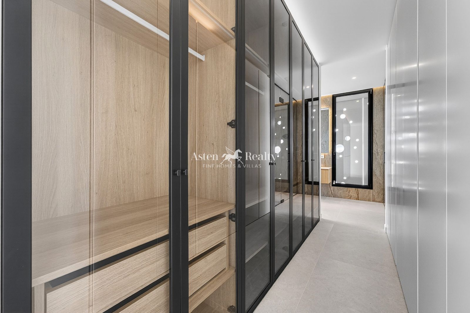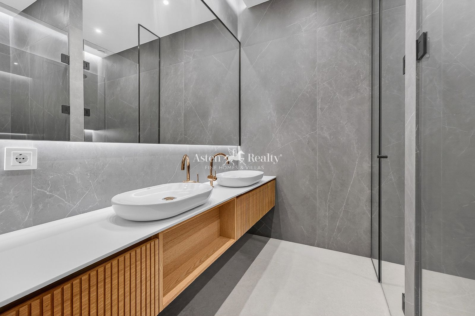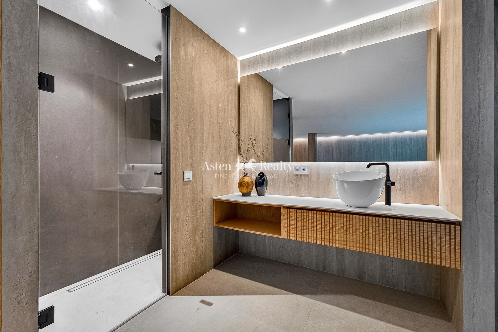 En la planta baja, la villa sorprende con una zona de bienestar privada que incluye spa, sauna, gimnasio, sala polivalente y un amplio garaje para cuatro vehículos. Las tres plantas están conectadas por un ascensor y una escalera escultural que añade presencia y carácter a la arquitectura.