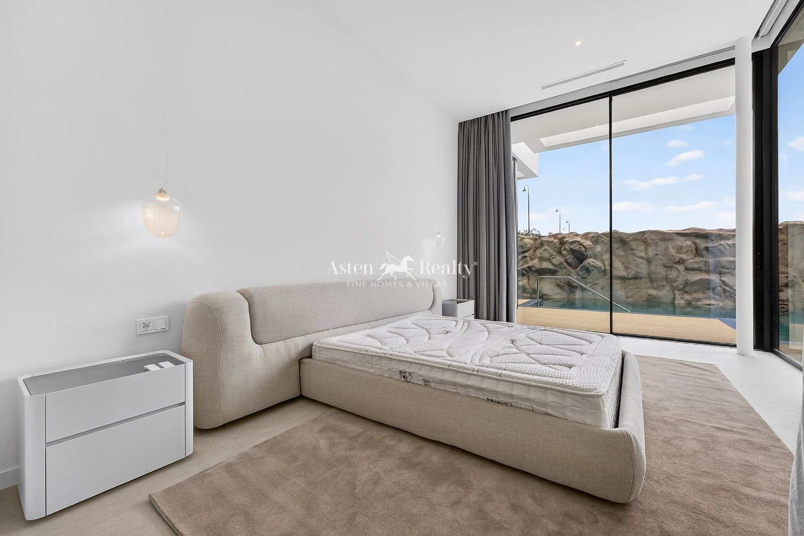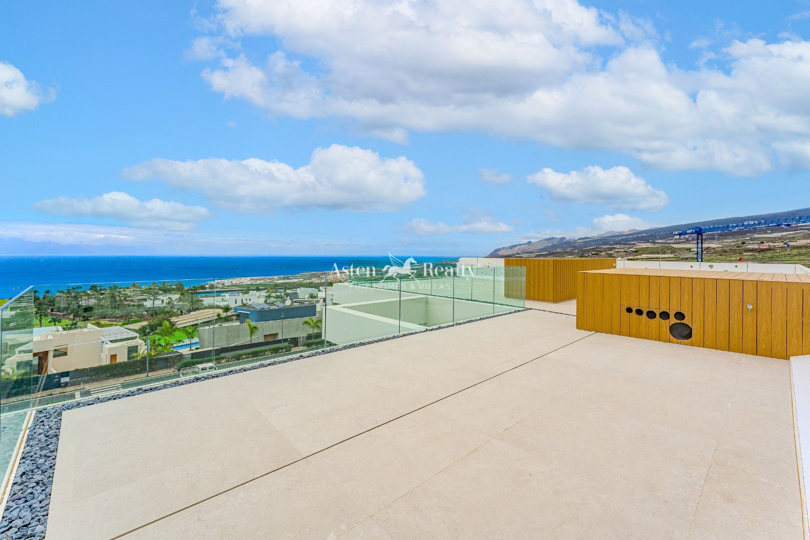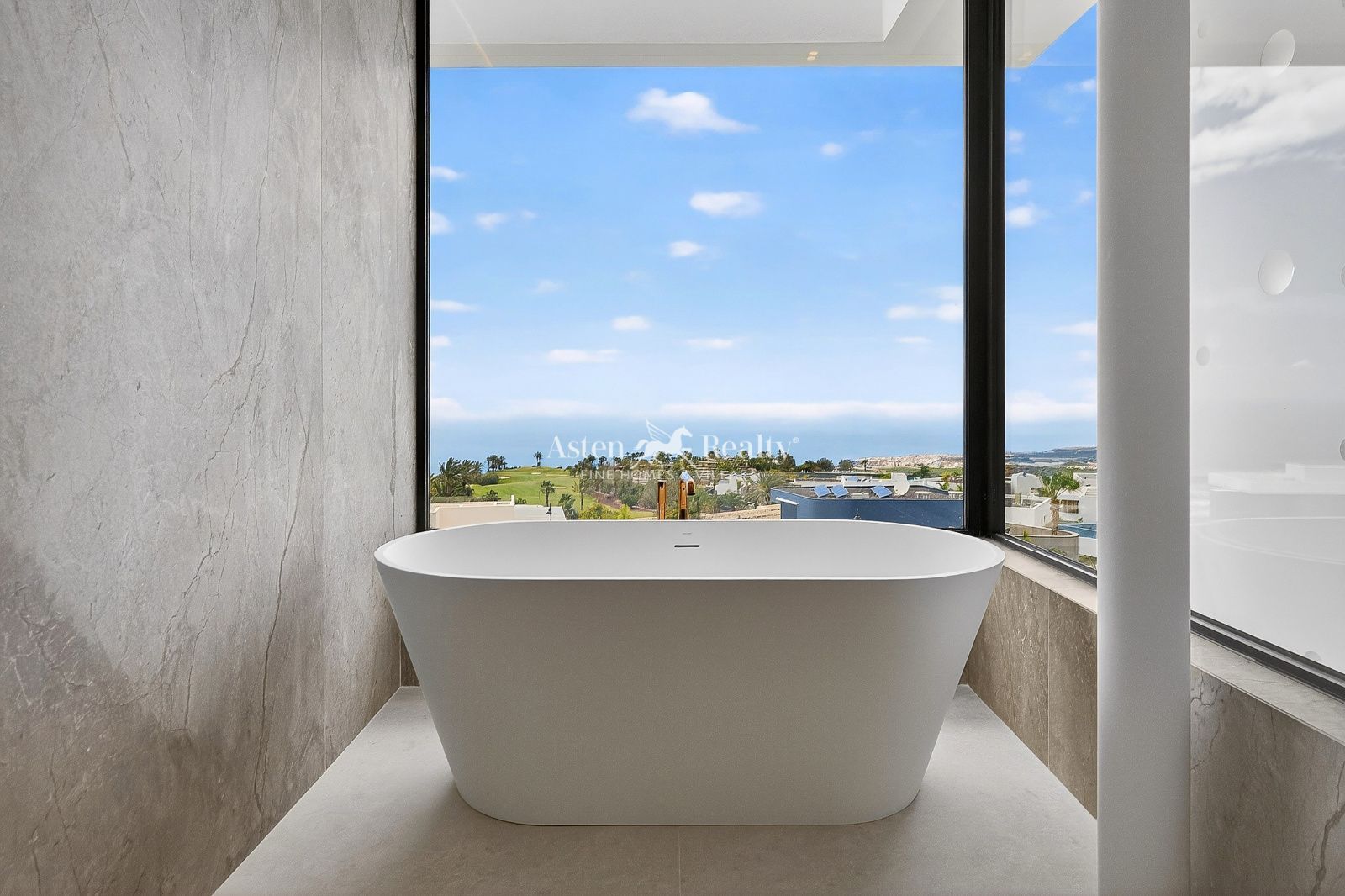 En el interior, el dormitorio principal ocupa la planta superior y disfruta de amplias vistas al campo de golf, al océano y a las siluetas de La Gomera, El Hierro y La Palma. Cuenta con un cuarto de baño en suite y un amplio vestidor. Un segundo dormitorio en este mismo nivel también ofrece un baño en suite. Ambos conectan directamente con una gran terraza, un lugar acogedor para simplemente hacer una pausa y disfrutar del paisaje. Arriba, un solárium en la azotea añade otro rincón mágico, ideal para admirar las puestas de sol que parecen extenderse infinitamente.