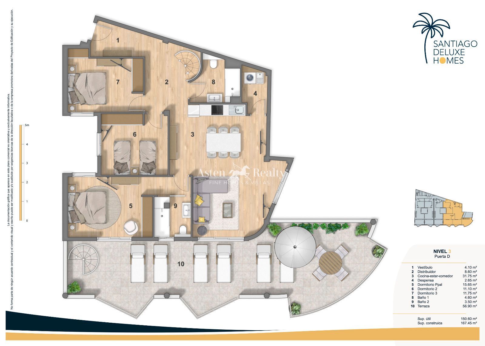 Dúplex planta 3/4 A, 2 dorm, 2 baños, 107,40 m2 total con 26,05 m2 de terrazas, PRECIO €455.000