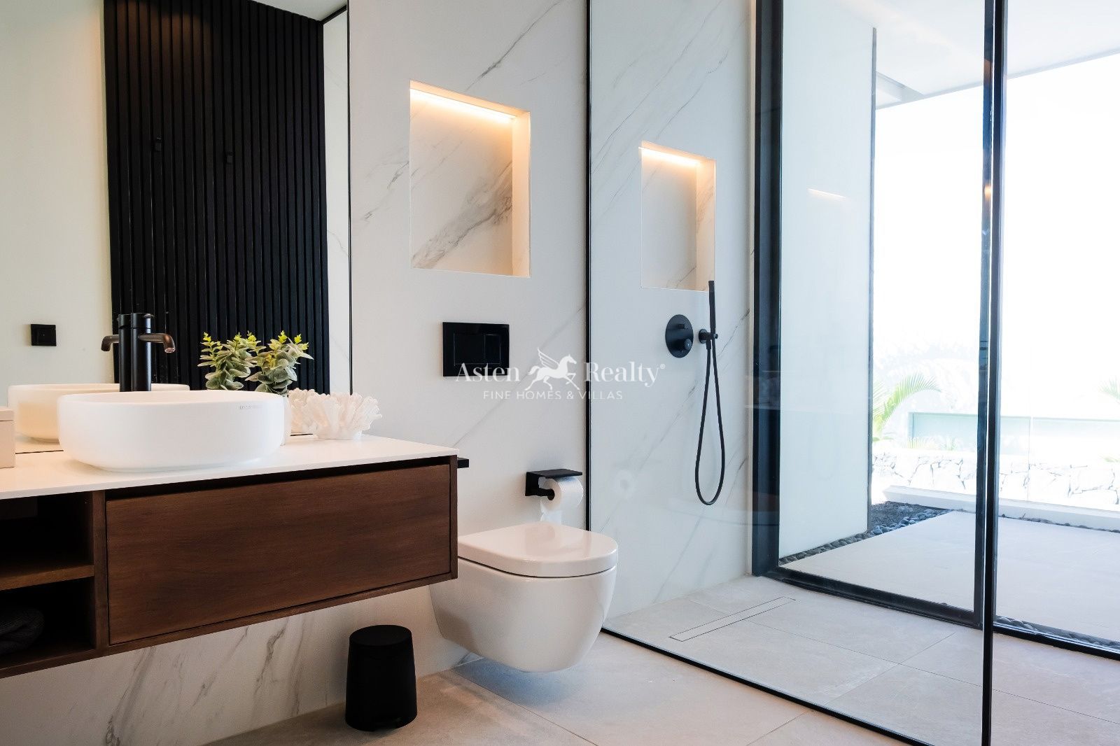 Con 430 m2 construidos sobre una parcela de 772 m2, la propiedad alberga cuatro dormitorios en suite con armarios empotrados y acceso directo a un exuberante jardín tropical. La armonía entre materiales nobles, arte contemporáneo y líneas limpias crea una atmósfera de serenidad y sofisticación.